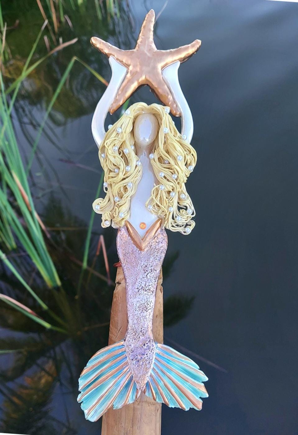 This lovel Golden haired mermaid tree topper is holding a Golden star.
