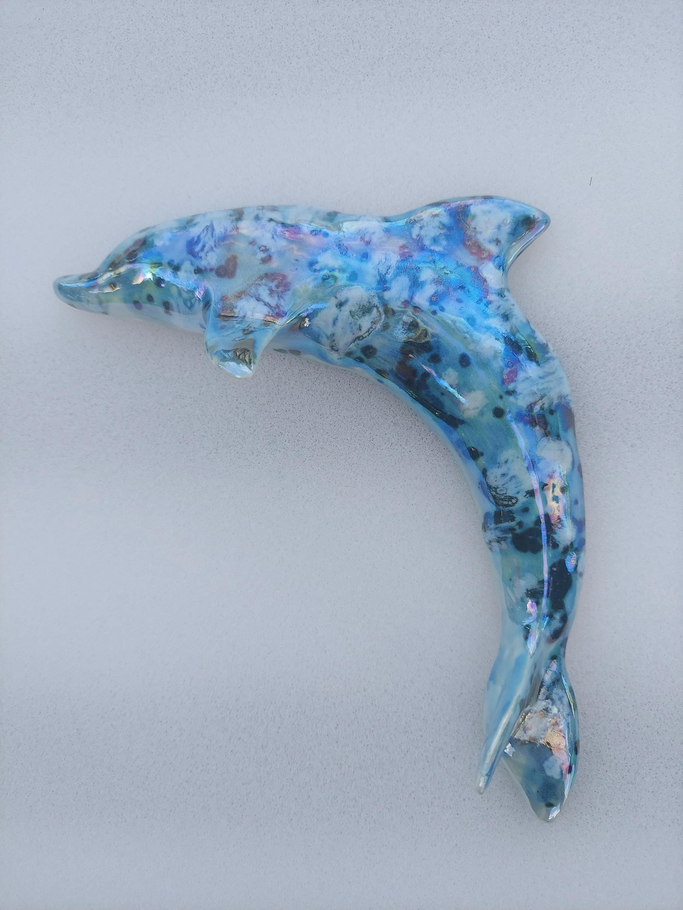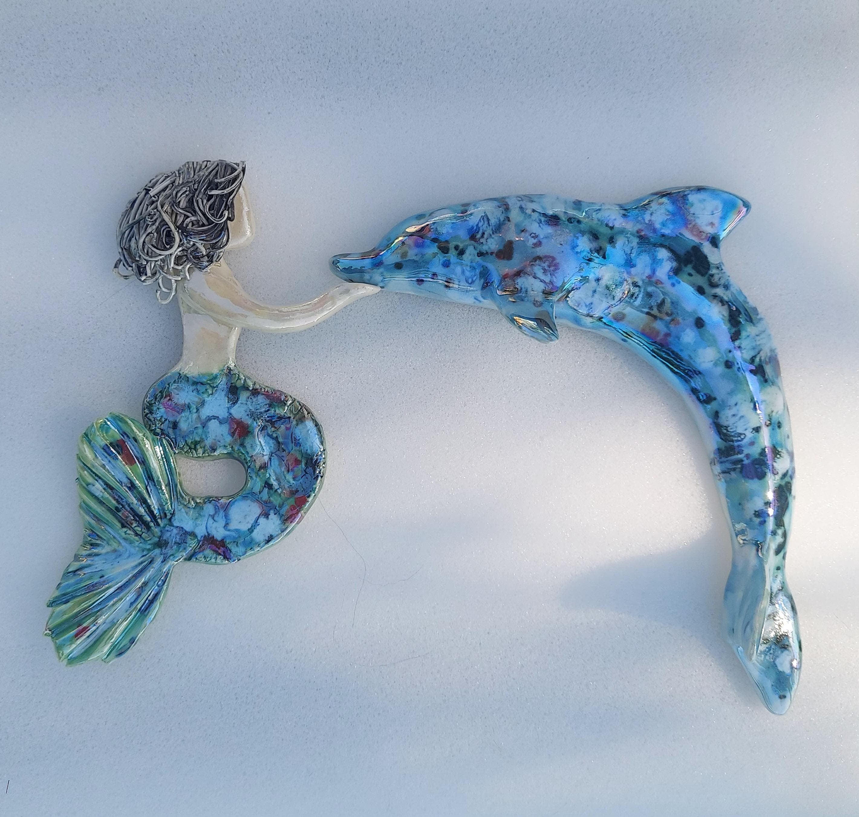 This phenomenal duo; two kindered spirits of the sea are joined together for endless life times to come. Sculpted from earthen clay, They've gone through 3 seperate kiln firings, first a Bisque firing, second a glaze firing after a few coats of glaze were applied along with plethora of crumbled seaglass, and a final third firing of a mother of pearl overglaze to give them that under the sea luster.