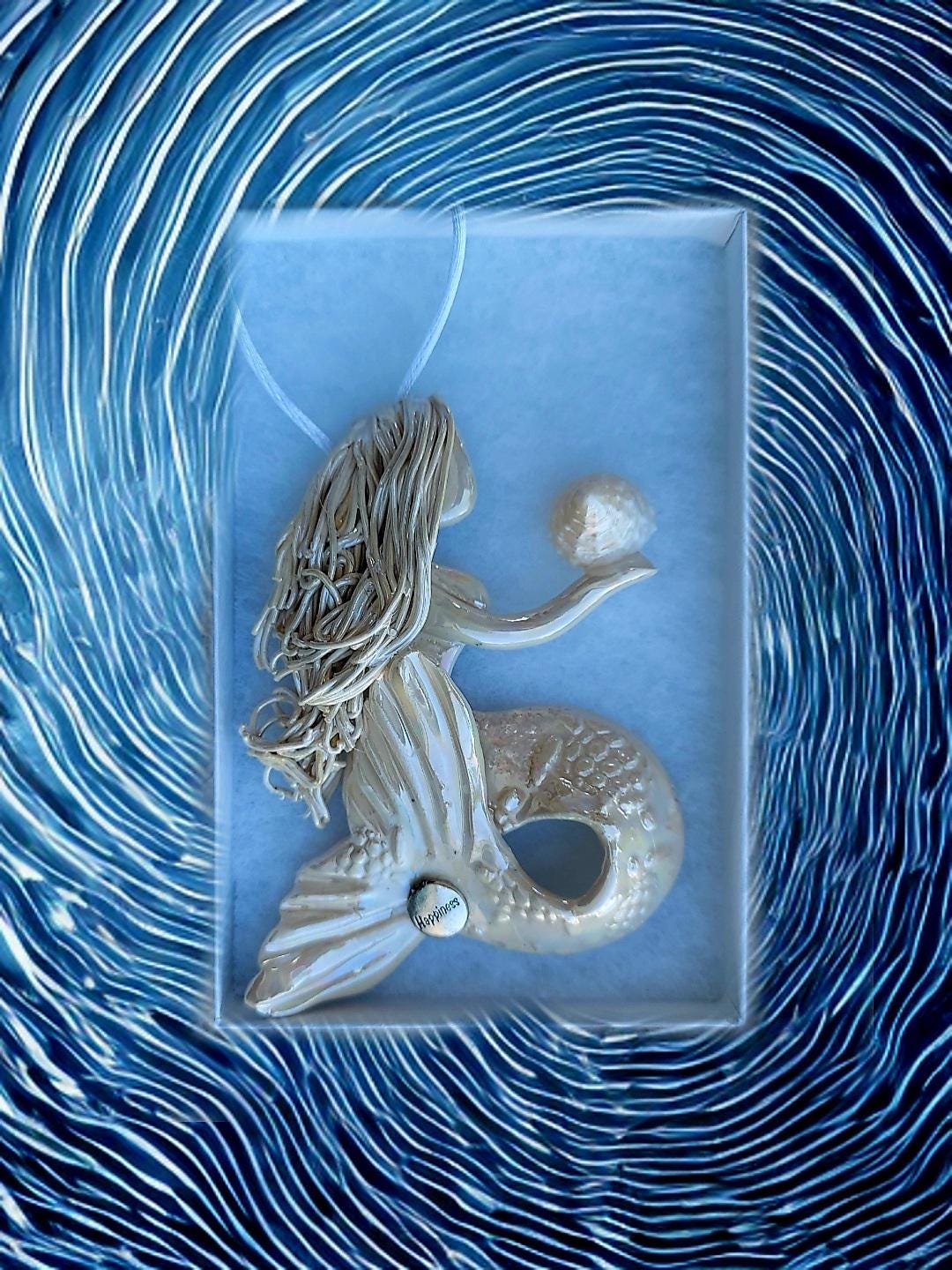 This one of a kind, hand made Mermaid is adoring a beautiful gift from the sea.