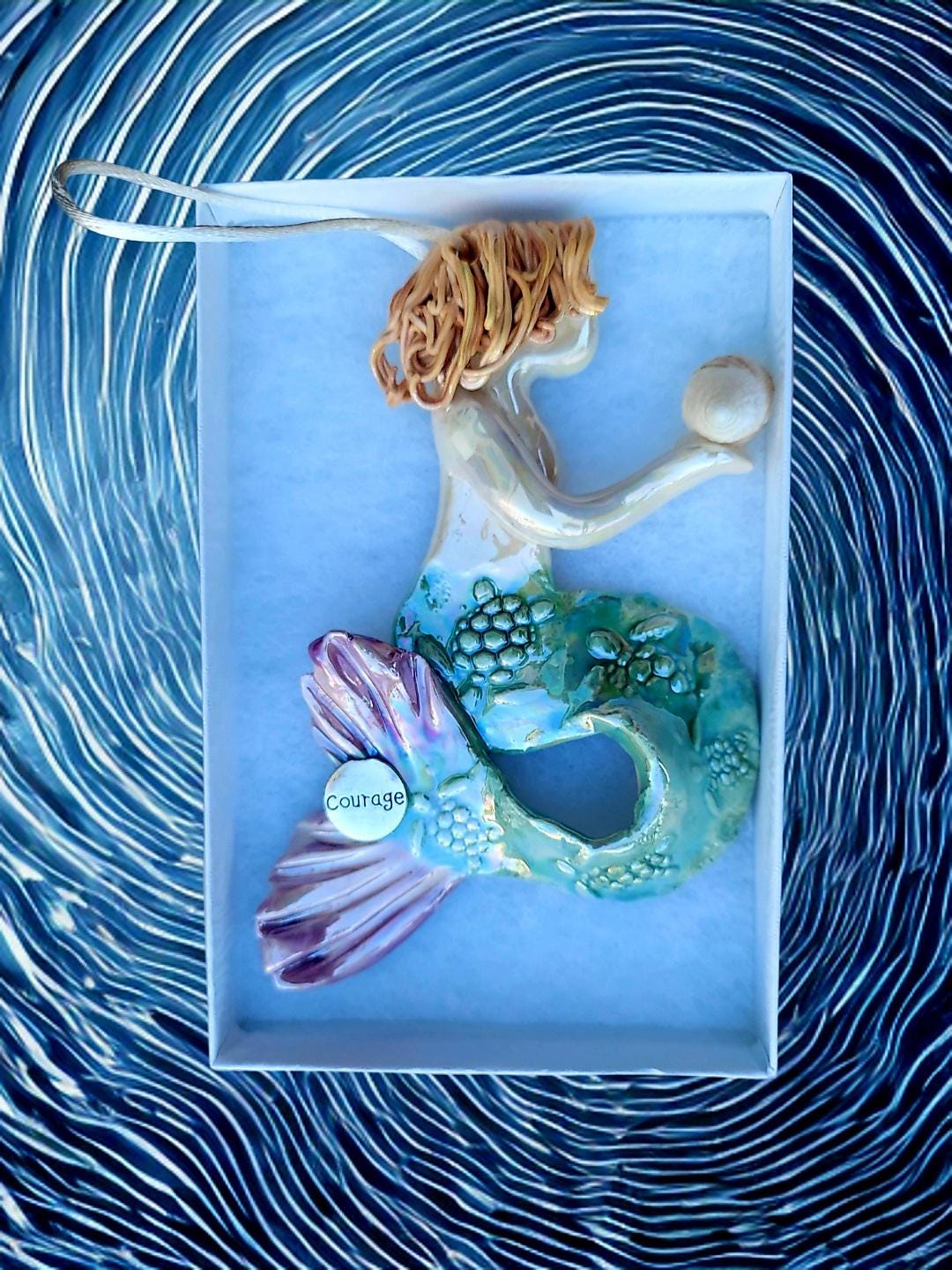 He's been hand glazed, fired then reglazed with a mother of pearl overglaze to give her that under the sea luster