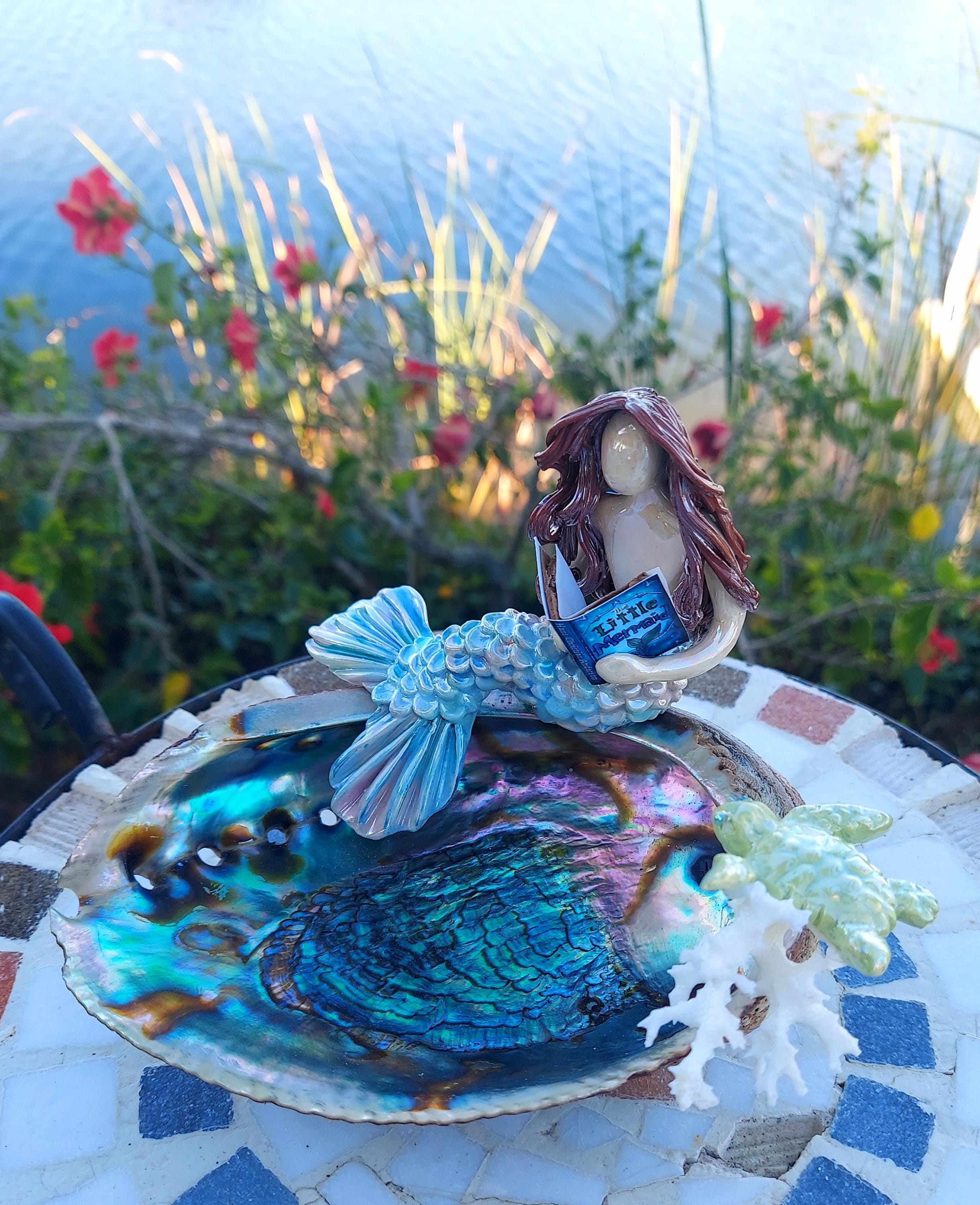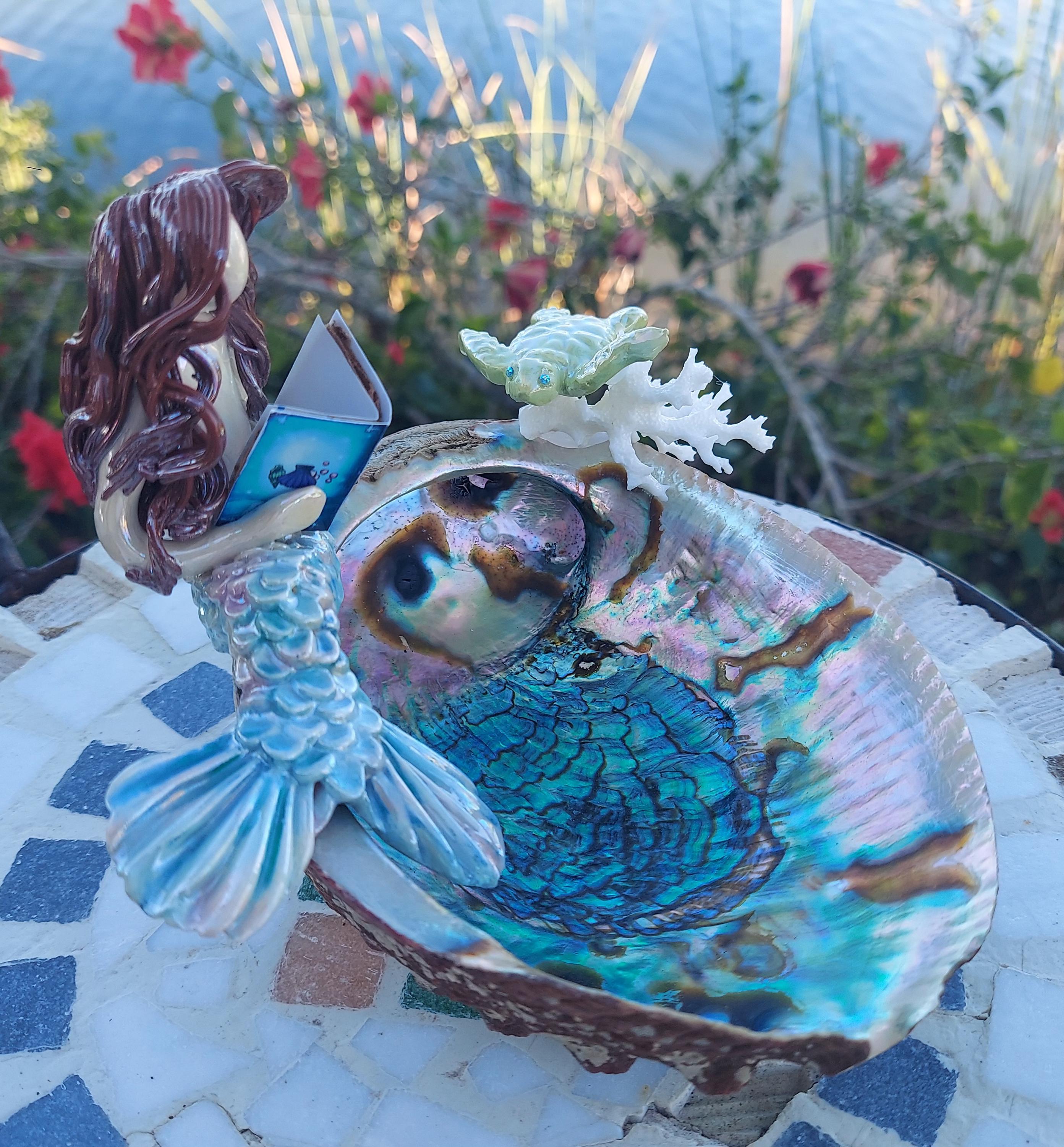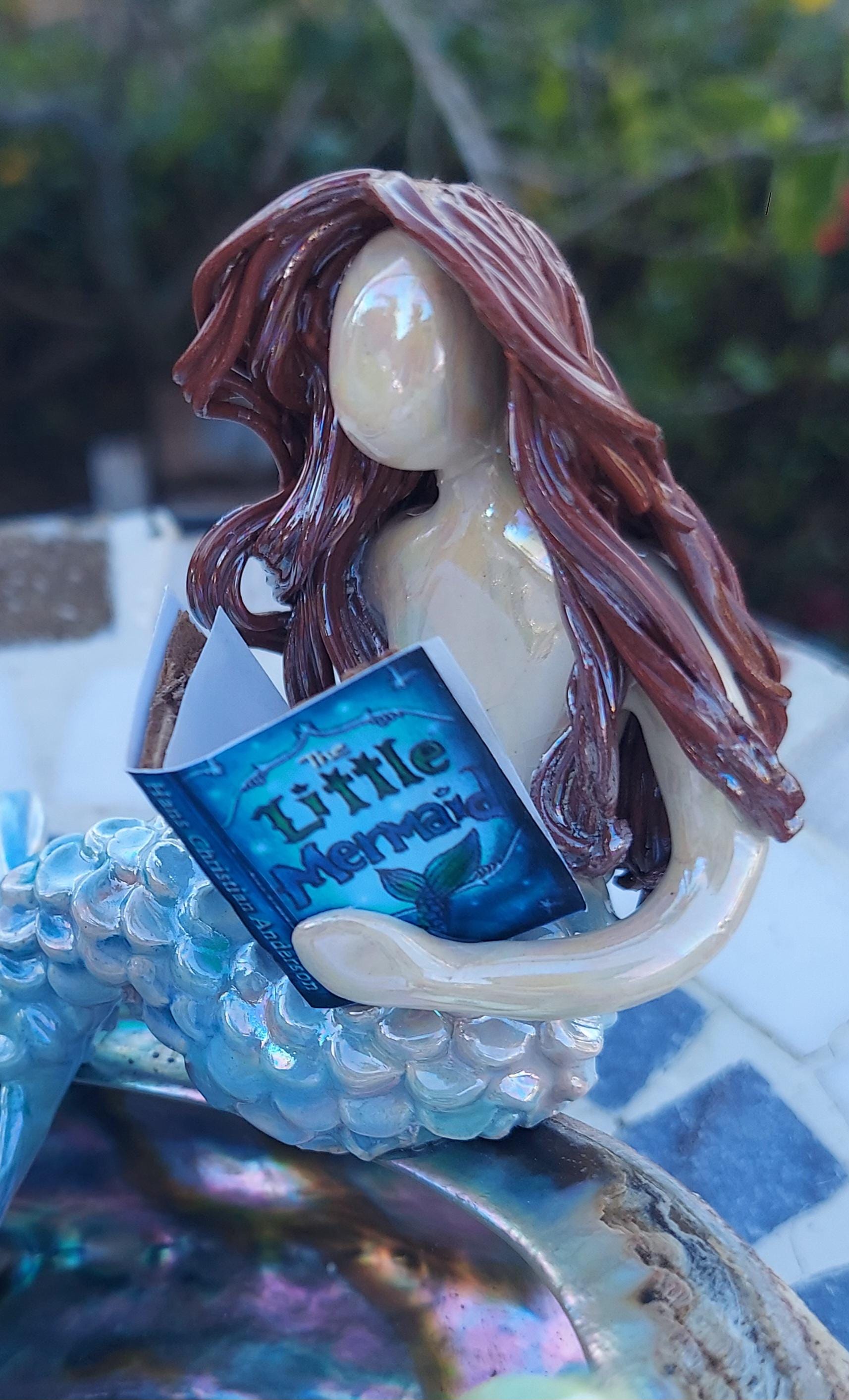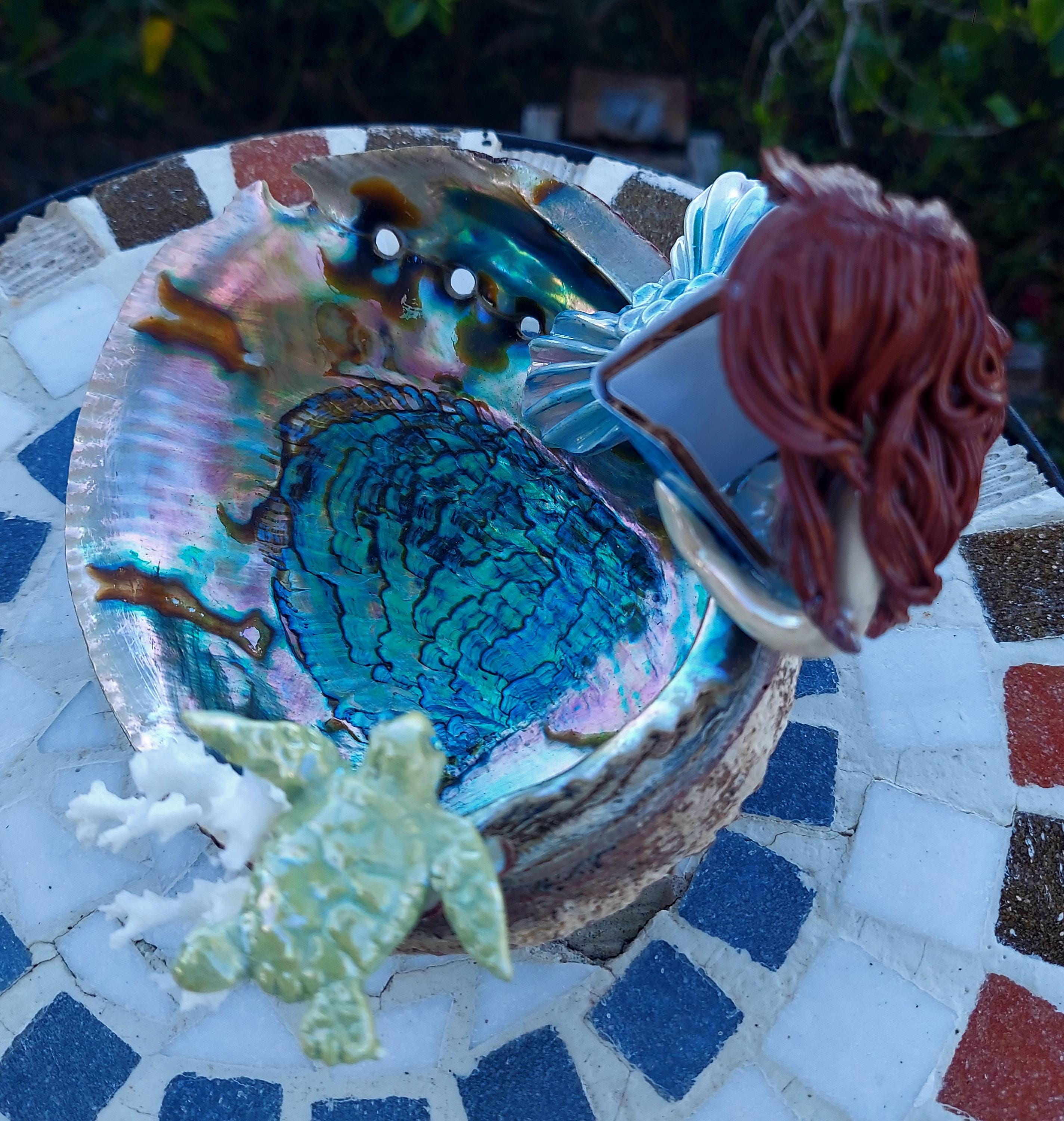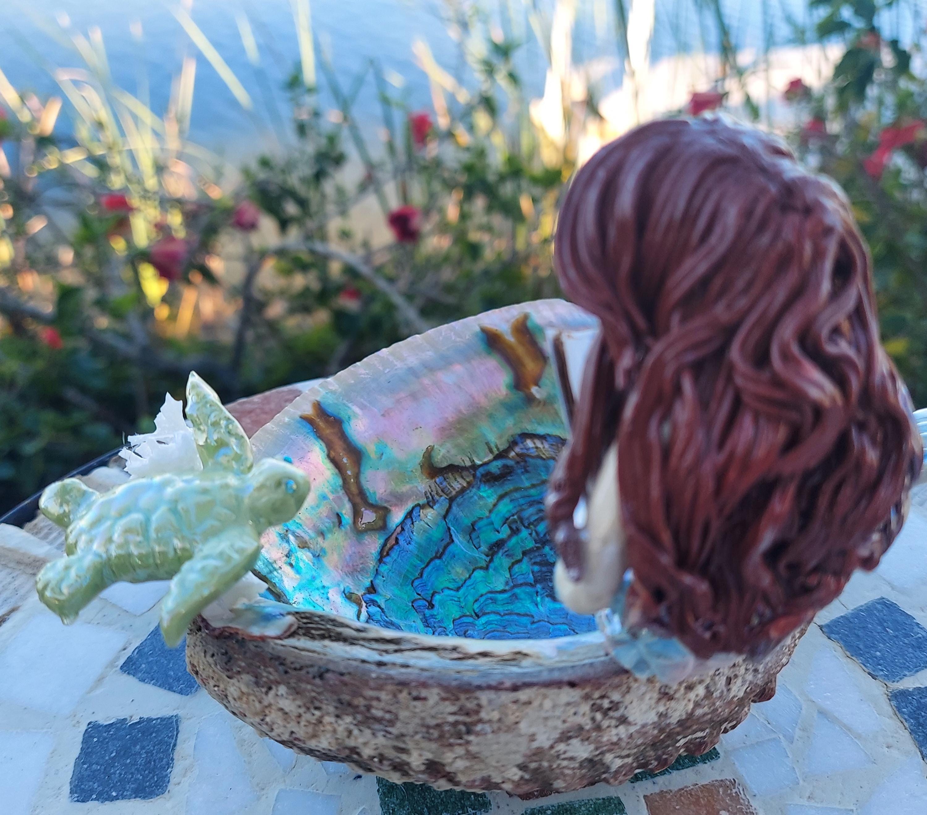 This lovely one of a kind auburn haired mermaid sits upon the edge of real abalone sea shell.