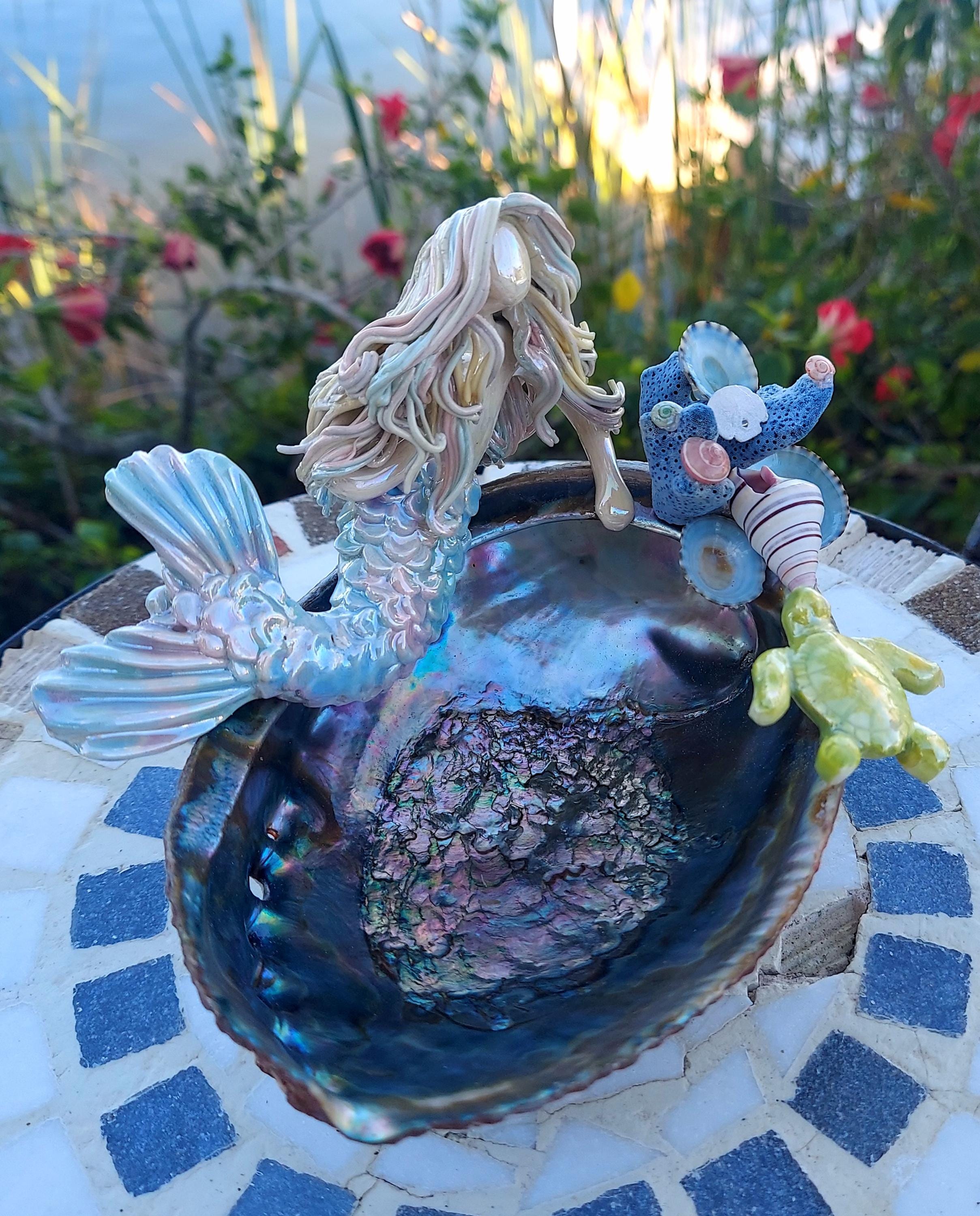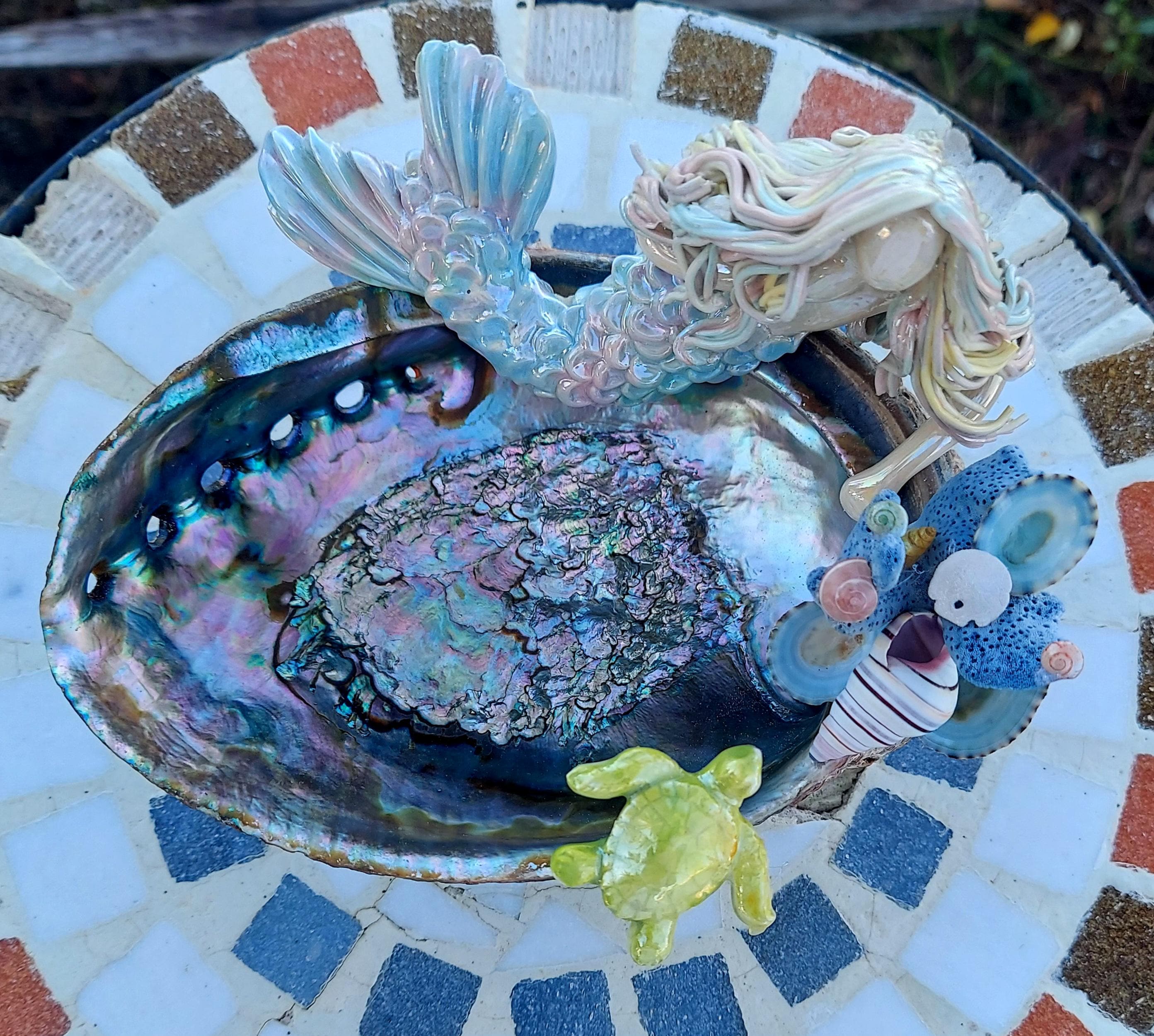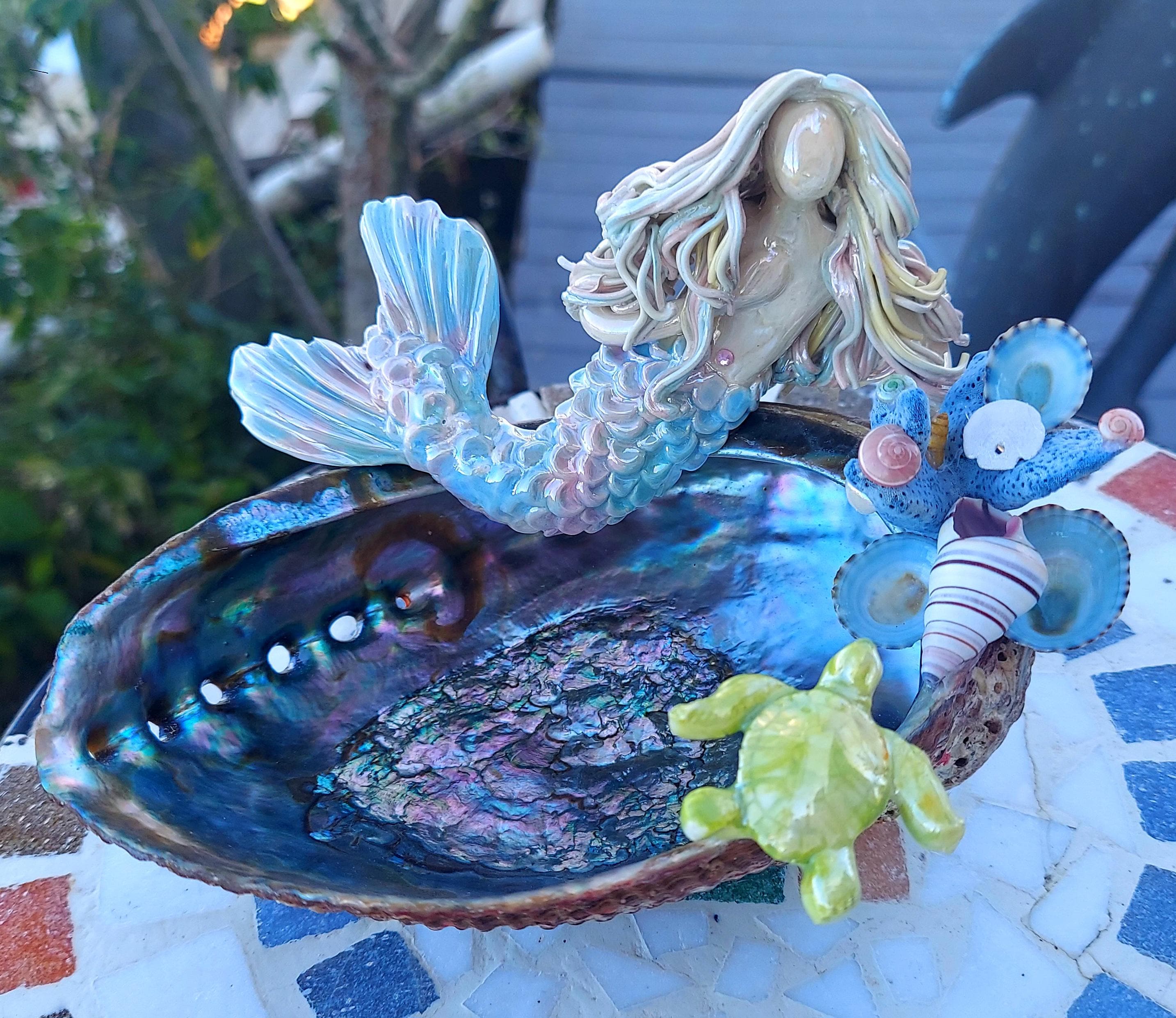 This lovely one of a kind Rainbow mermaid sits upon the edge of a abalone sea shell.