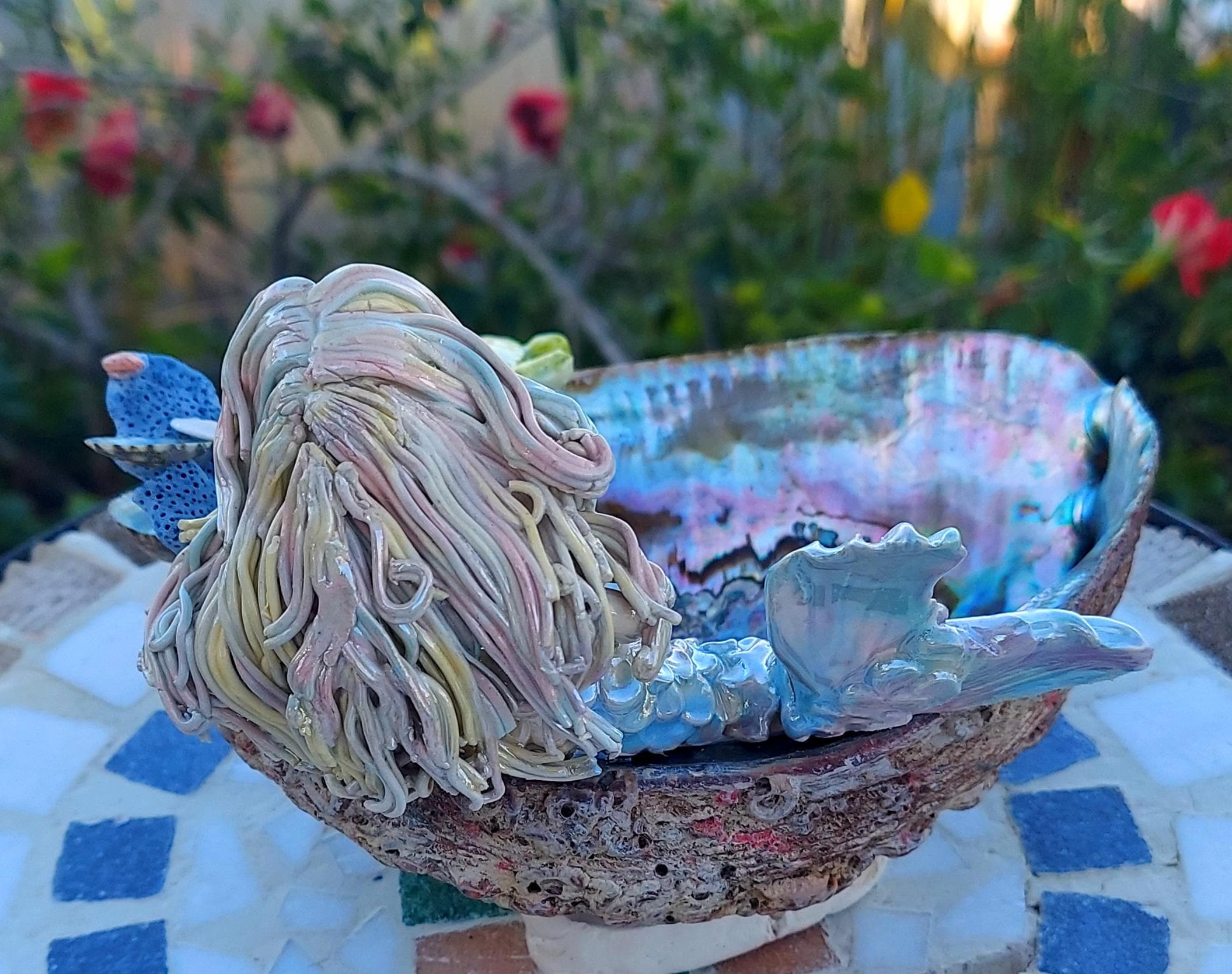 This piece is handbuilt, no molds, every scale, every strand of hair is handplaced, and she is signed. 1/1