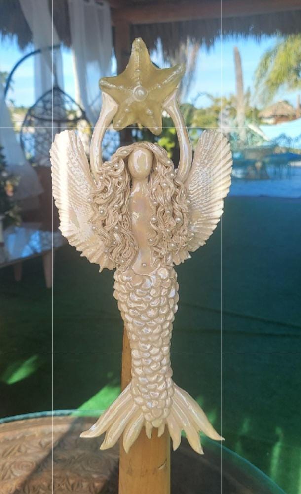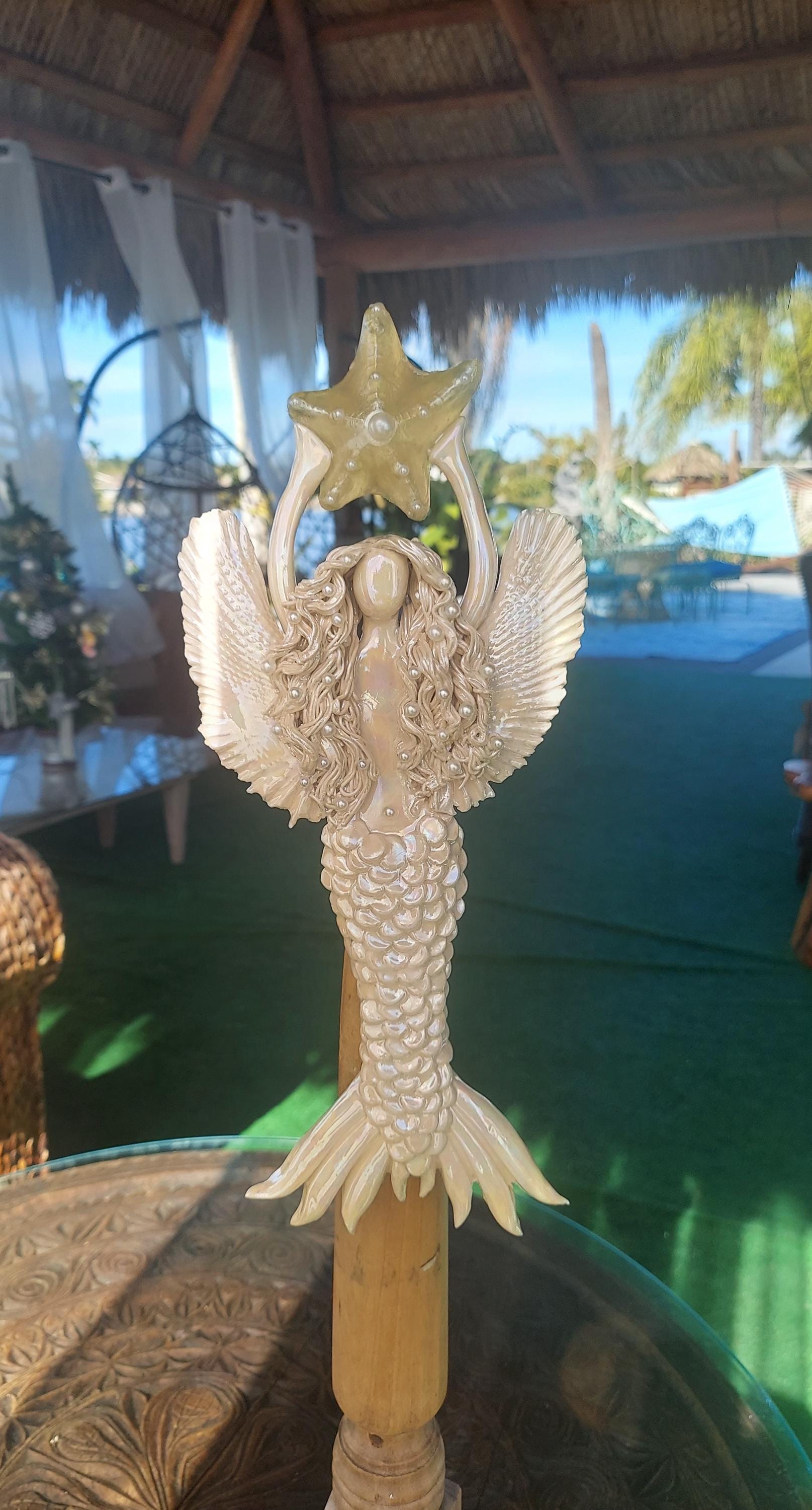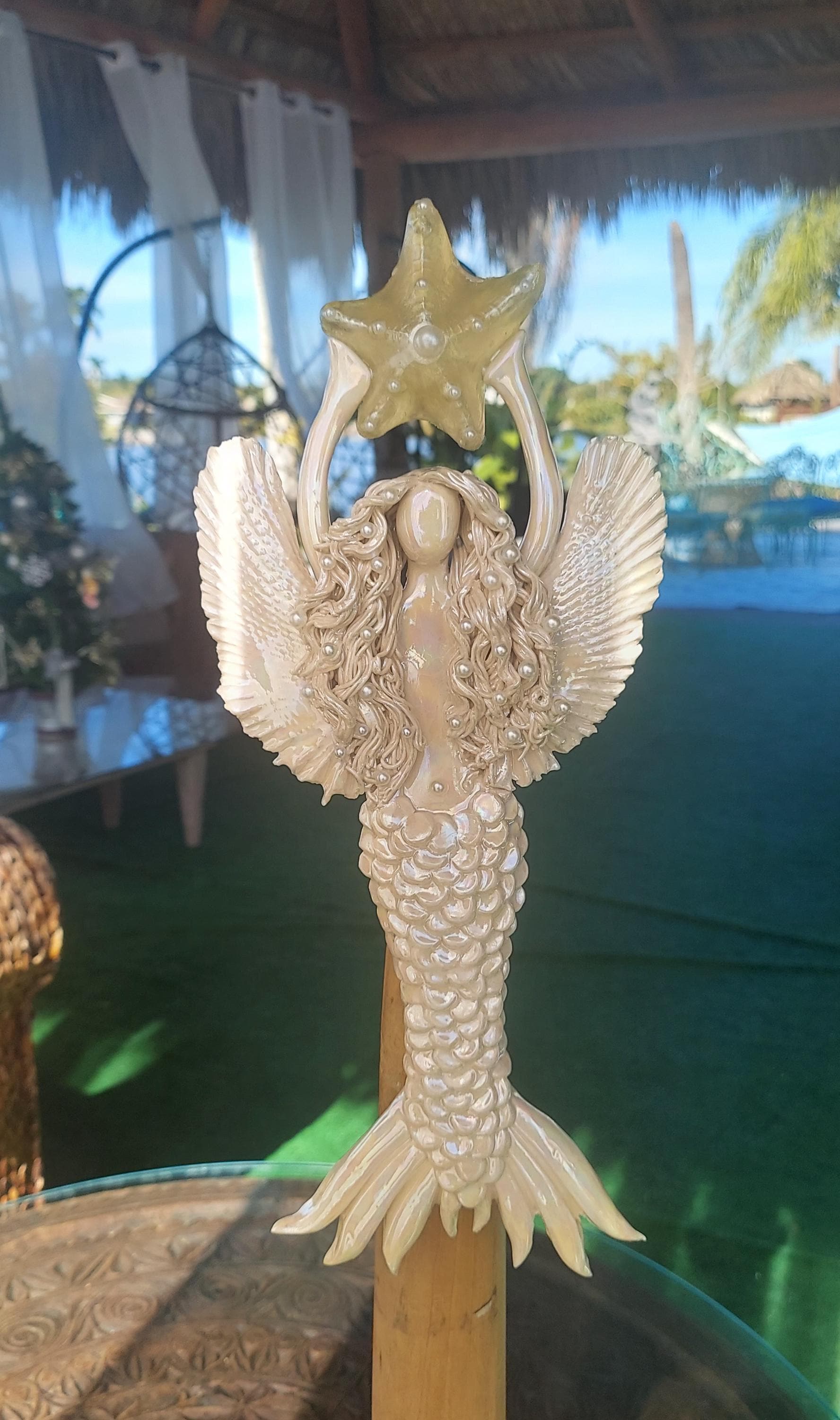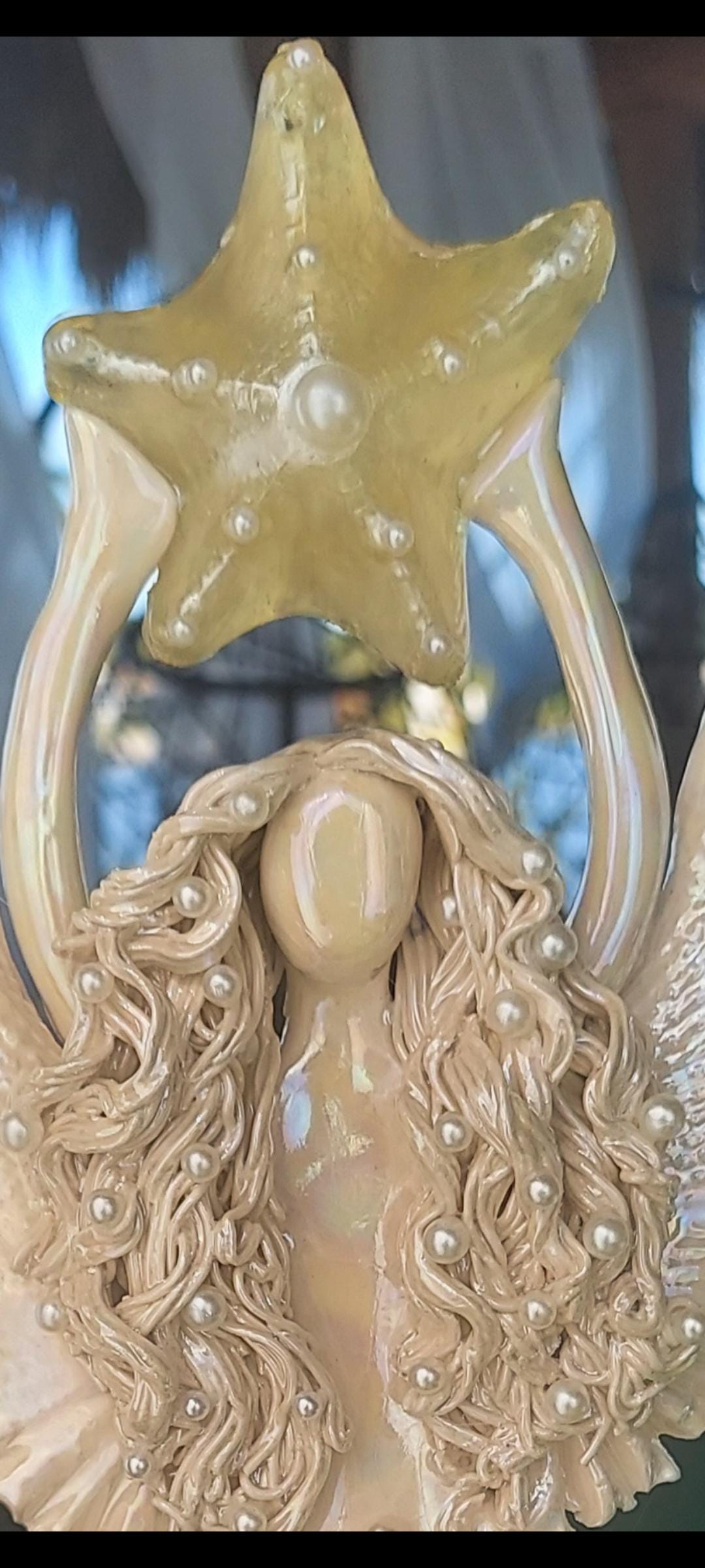This lovely Mother of Pearl mer-angel tree topper is holding a pearlized Starfish.