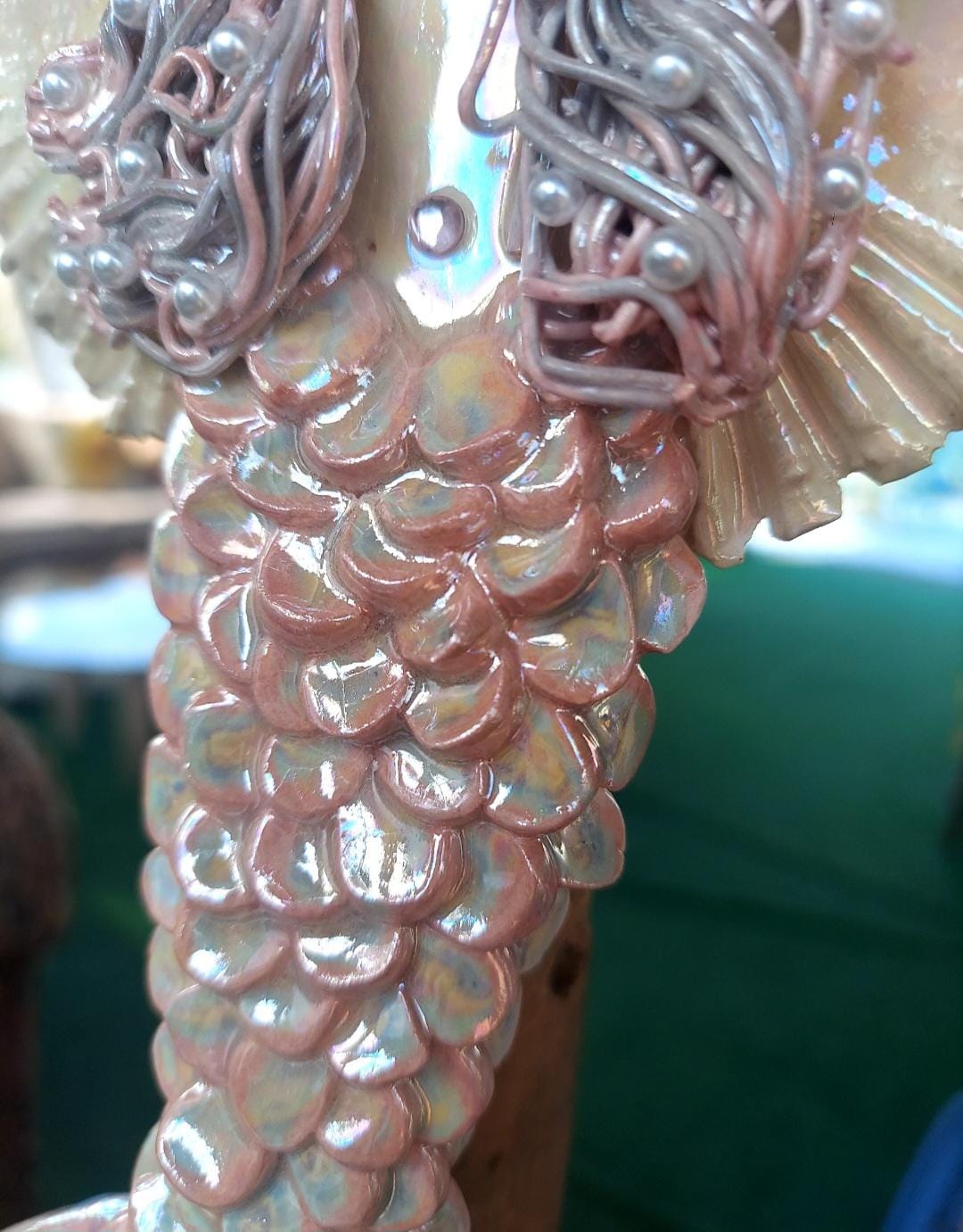 Her scales made from clay are cut one by one and placed in order. I use different dyes in my clay so that each scale is like a finger print, quite original.