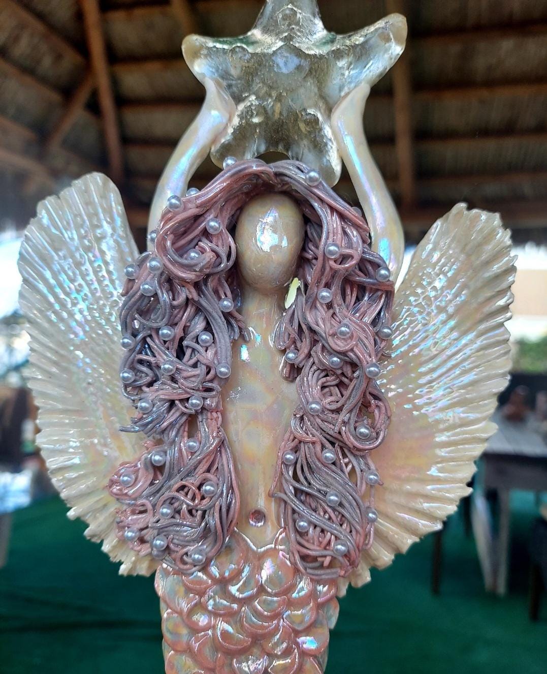 This lovely Angel Mermaid tree topper is holding a clear Starfish, ready to shine ever so bright.